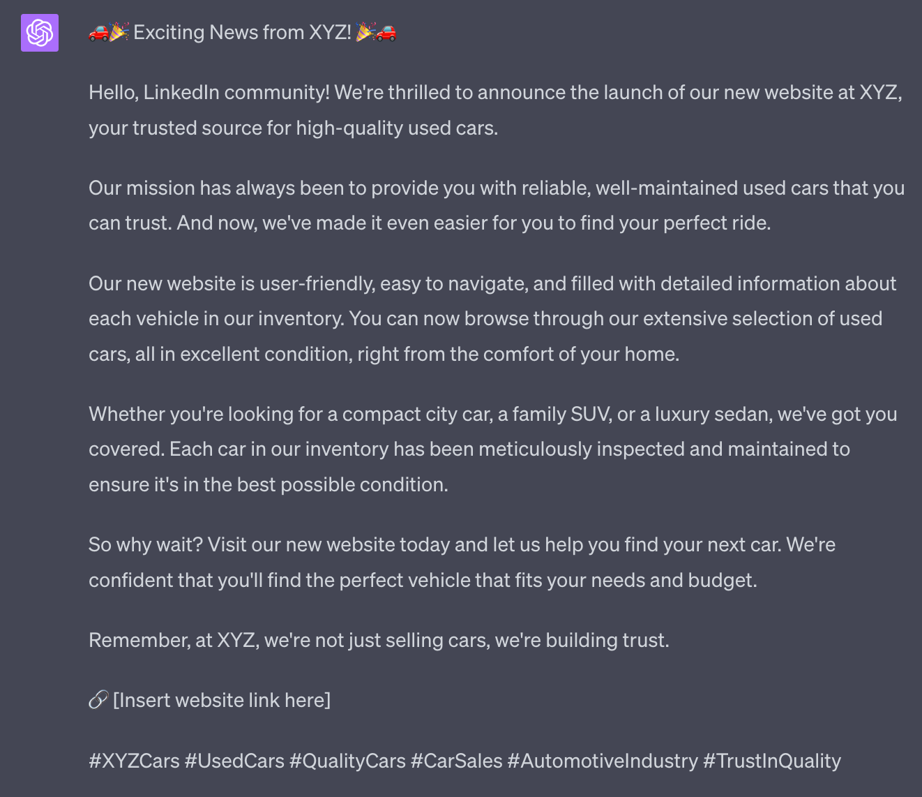 Thus, for example, a typical prompt could be the following: «Write the text for a LinkedIn post in which you encourage users to visit the new website of my company, XYZ, which is dedicated to selling used cars in very good condition».