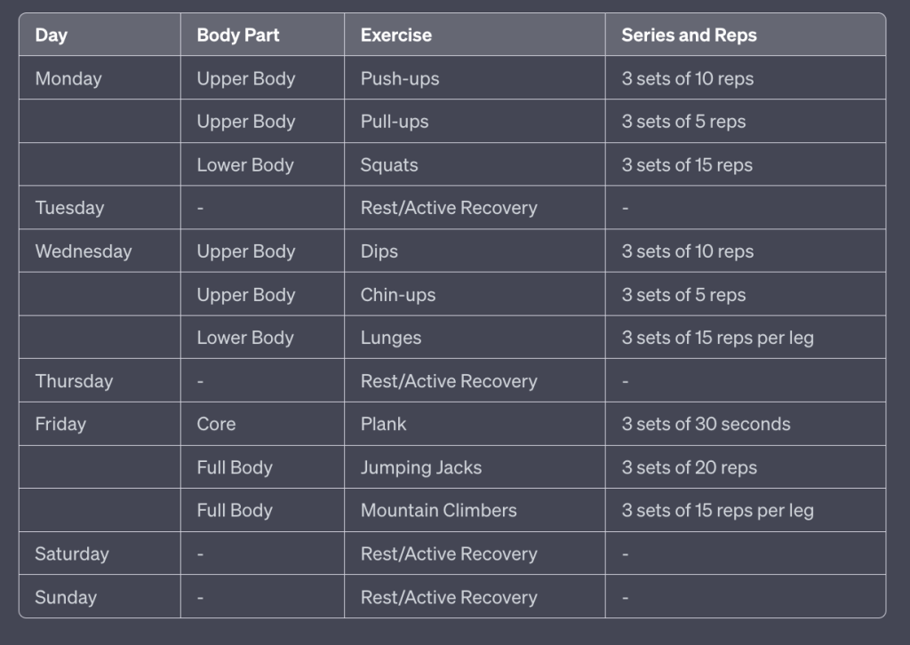 For example, if you’ve asked for a calisthenics training plan, it usually provides the response in text form. Afterwards, you just have to ask it to format it into a table, and it will do it perfectly:
